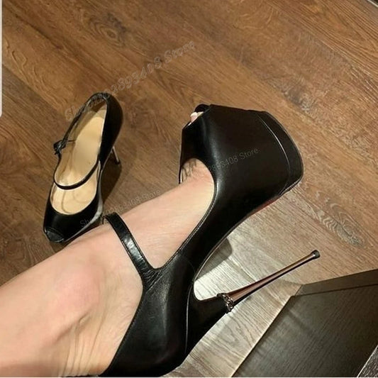 💜Black Matte Leather Platform Peep Toe Buckle Metal Stiletto Heel Fashion 2024 Pumps💜